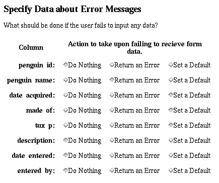Another often used feature missing from this system is the ability to fill in a select, checkbox or radiobutton from values pulled from another table in the system. For instance, in my Penguin Management System, I might have had another table listing materials of which penguins might be made, and I would want the page to find this list from the database, rather than always using a pre-specified list.
