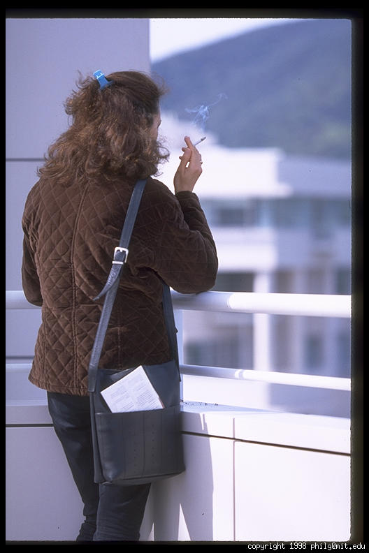 Smoking on the terrace overlooking the city. Getty Center. Los Angeles, California.
