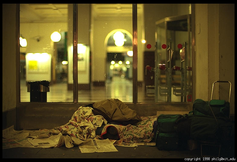 Travelers sleeping outside central train station in Stockholm (which is locked at night)
