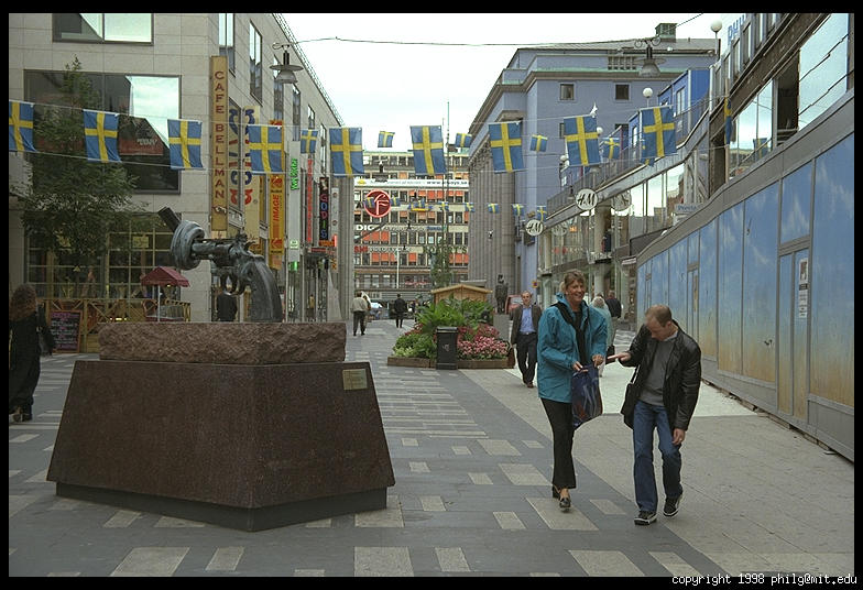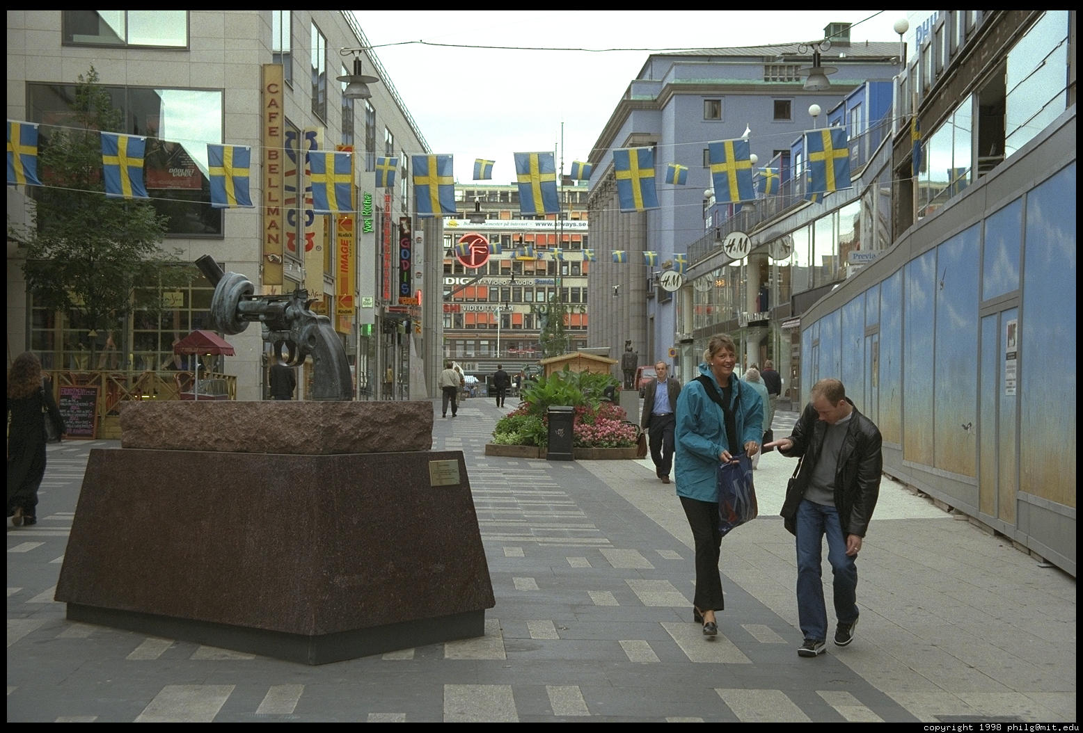A street for pedestrians in central Stockholm with an anti-violence gun statue