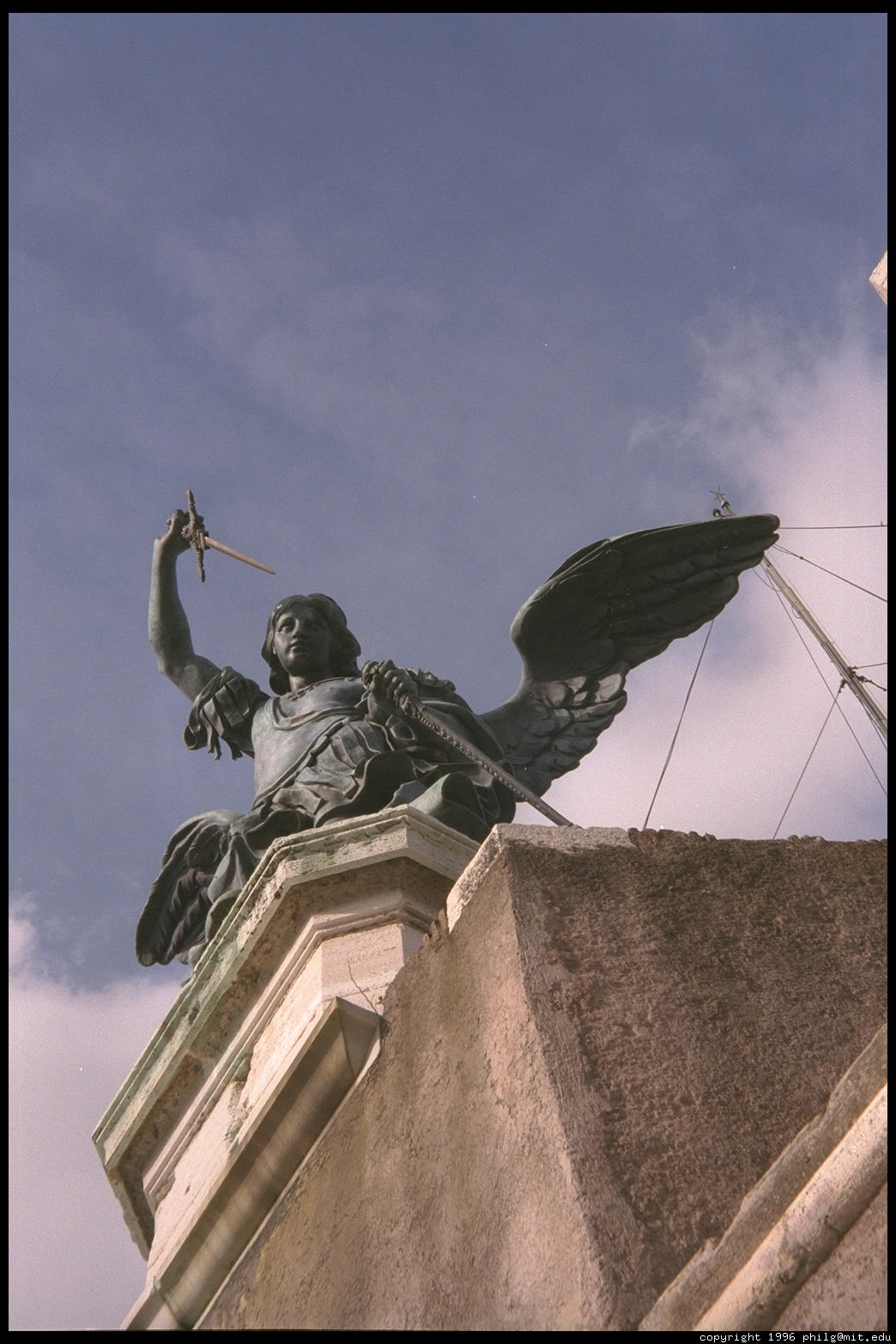 State of the Archangel Michael, atop Castel Sant'Angelo in Rome. This is by the 18th century Flemish sculptor Pieter Verschaffelt. Legend has it that in the year 590, the Archangel Michael appeared above the castle. Now he appears above the castle all day ever day.