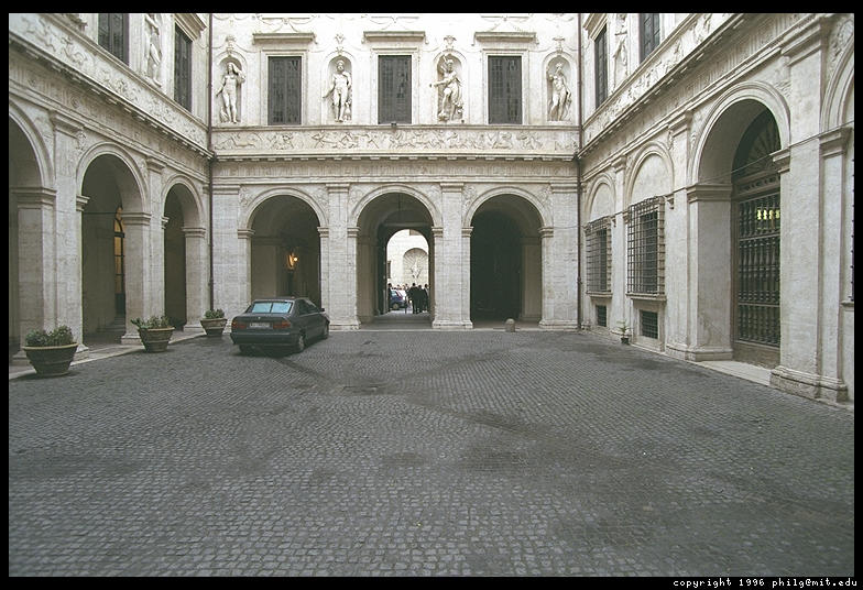 Palazzo Spada, near Rome's Campo de Fiori. This was built in 1540 for a cardinal and improved by Cardinal Bernardino Spara and his brother Virginio in the 17th century. They assembled a big art collection which is open to the public and hired Borromini to construct a clever gallery that appears longer than it is due to successively shortened columns.