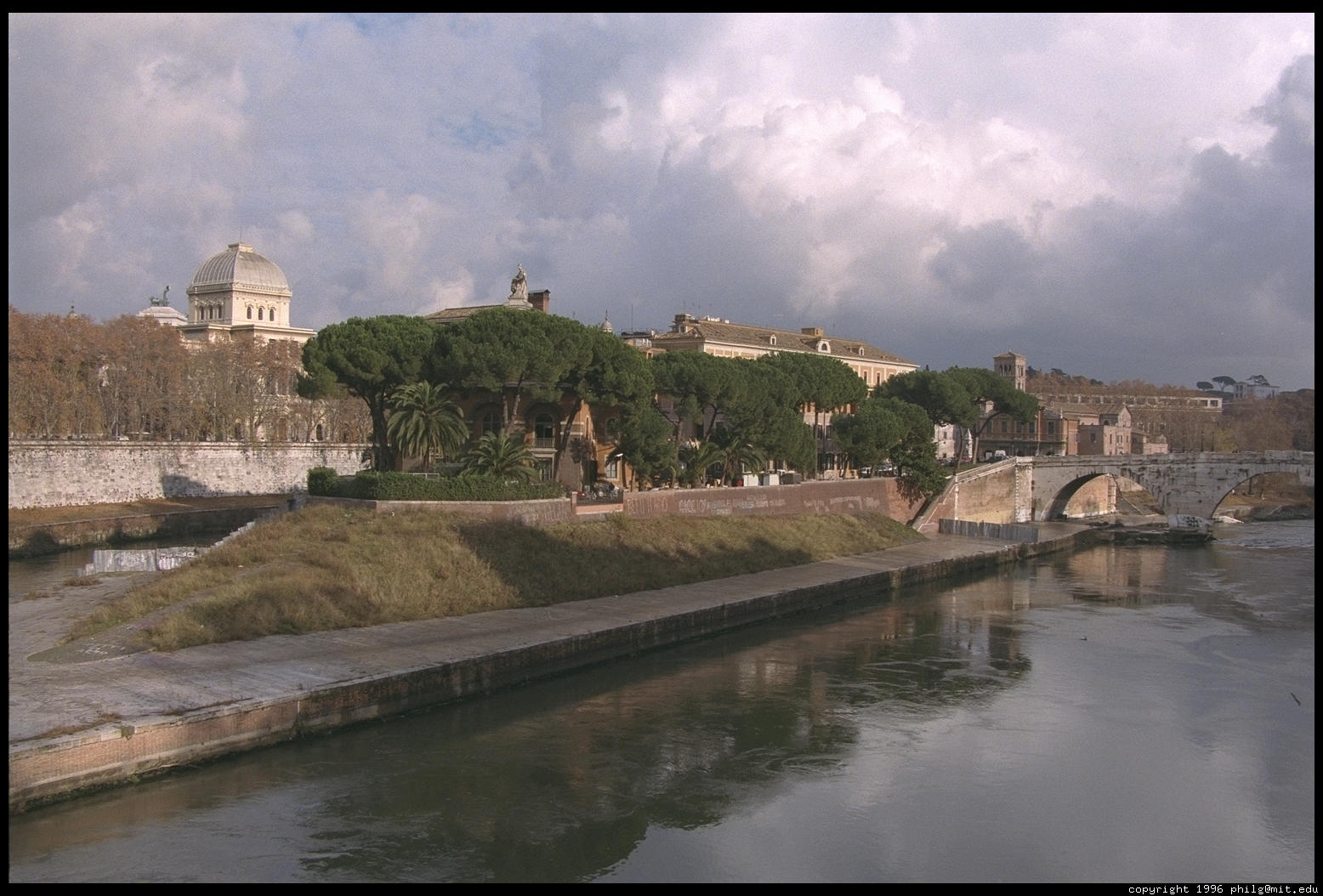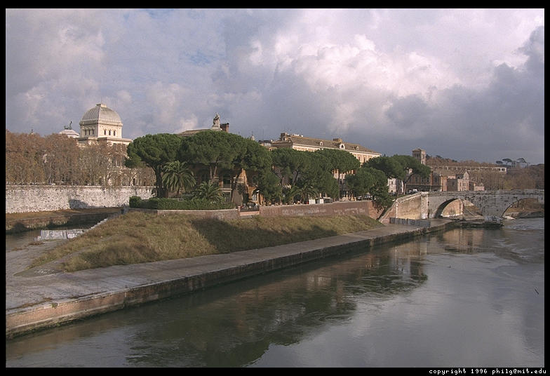 Tiber Island, home to a hospital, across from Trastevere, with Rome's synagogue in the background