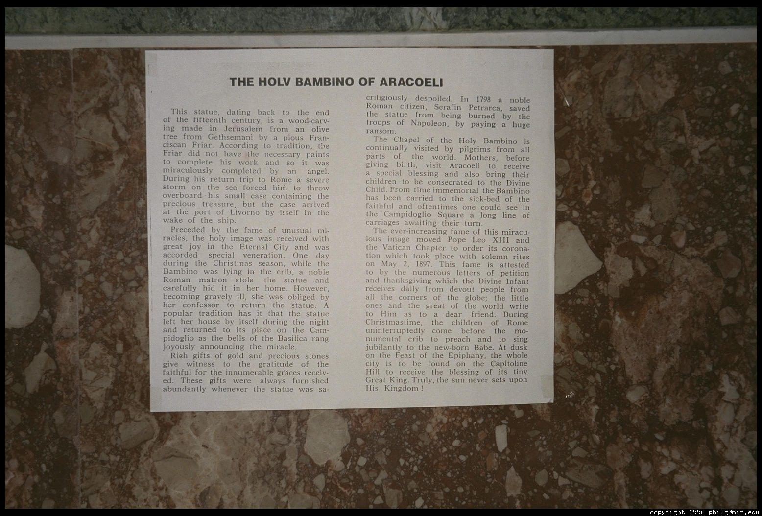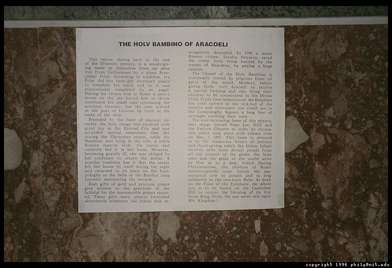The Santa Bambino inside Santa Maria in Aracoeli, atop Rome's Capitol hill. A 15th-century Franciscan monk carved this olive-wood figure of the Christ Child. A sign explains that he lacked paint to decorate the idol so a saint came down and finished it for him. While being transported on a boat, the Bambino was washed overboard but miraculously arrived at its intended destination on its own. The idol is richly attired in fine fabrics and jewels, gifts from people who have been helped by its powers. Sometimes the Bambino is carried to the beds of the gravely ill. If it can help the sick person, the wooden lips turn purple. If not, the lips turn pale.