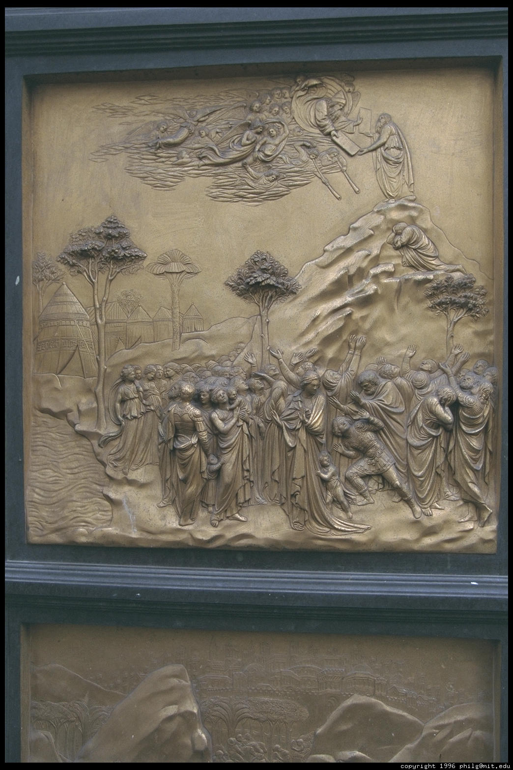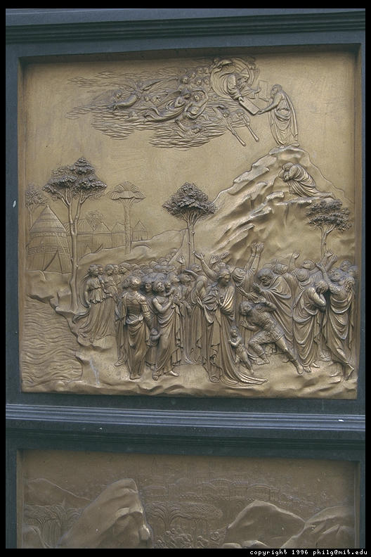 Moses Receives the Ten Commandments, one of Lorenzo Ghiberti's 10 panels in the east door of Florence's Baptistry (c. 1430)
