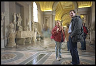 The backyard of the Vatican, from St. Peter's The Vatican Museums, from St. Peter's The Bernini Colonnade, from St. Peter's The circular staircase leading up to the Vatican museums.  It was designed by Giuseppe Momo in 1932 Inside the Sistine Chapel, where one isn't supposed to take photos (though I didn't know that; I though they just didn't permit flash) When you're done with the Vatican Museums, walk out the door and jog to the right then half a block down Via Santamaura to the Fonzi Bar (#23), run by the Fonzi family since 1910.  They have a <i>tavola calda</i> with good vegetables.  If you take a left out of the bar and then another left you'll eventually come to a nice ice cream shop on your left. The statue of Marcus Aurelius at the Campidoglio, being restored under the direction of sculptor Guido Veroi Walking into the Palazzo Nuovo, one of the Capitoline Museums in Rome Bronze of Marcus Aurelius from the 2nd century AD, once in the center of Rome's Campidoglio but now housed in the adjacent Palazzo Nuovo (museum) Newlyweds pose atop Rome's Capitol hill A creche inside Santa Maria in Aracoeli, atop Rome's Capitol hill A creche inside Santa Maria in Aracoeli, atop Rome's Capitol hill The Santa Bambino inside Santa Maria in Aracoeli, atop Rome's Capitol hill.  A 15th-century Franciscan monk carved this olive-wood figure of the Christ Child.  A sign explains that he lacked paint to decorate the idol so a saint came down and finished it for him.  While being transported on a boat, the Bambino was washed overboard but miraculously arrived at its intended destination on its own.  The idol is richly attired in fine fabrics and jewels, gifts from people who have been helped by its powers.  Sometimes the Bambino is carried to the beds of the gravely ill.  If it can help the sick person, the wooden lips turn purple.  If not, the lips turn pale. The Santa Bambino inside Santa Maria in Aracoeli, atop Rome's Capitol hill.  A 15th-century Franciscan monk carved this olive-wood figure of the Christ Child.  A sign explains that he lacked paint to decorate the idol so a saint came down and finished it for him.  While being transported on a boat, the Bambino was washed overboard but miraculously arrived at its intended destination on its own.  The idol is richly attired in fine fabrics and jewels, gifts from people who have been helped by its powers.  Sometimes the Bambino is carried to the beds of the gravely ill.  If it can help the sick person, the wooden lips turn purple.  If not, the lips turn pale. The Santa Bambino inside Santa Maria in Aracoeli, atop Rome's Capitol hill.  A 15th-century Franciscan monk carved this olive-wood figure of the Christ Child.  A sign explains that he lacked paint to decorate the idol so a saint came down and finished it for him.  While being transported on a boat, the Bambino was washed overboard but miraculously arrived at its intended destination on its own.  The idol is richly attired in fine fabrics and jewels, gifts from people who have been helped by its powers.  Sometimes the Bambino is carried to the beds of the gravely ill.  If it can help the sick person, the wooden lips turn purple.  If not, the lips turn pale. Detail from the Arch of Titus in the Roman Forum.  It commemorates the victories of the Romans over the Jews in AD 68.  This relief shows a menorah from the Temple in Jerusalem being hauled back to Rome as booty. The Arch of Titus in the Roman Forum.  It commemorates the victories of the Romans over the Jews in AD 68. This creche, smack in the middle of Mussolini's Rome train station, shows that the idea of separation of church and state hasn't caught on in Italy The tomb of Nicolo Machiavelli, in Florence's Santa Croce. The tomb of Michelangelo, in Florence's Santa Croce. Home of Guido Veroi, from left his wife, Mario Valeriani, Veroi, and me Terrier on Florence's Ponte Vecchio Arches in Florence, by the river Moses Receives the Ten Commandments, one of Lorenzo Ghiberti's 10 panels in the east door of Florence's Baptistry (c. 1430) Lorenzo Ghiberti's 10 panels in the east door of Florence's Baptistry (c. 1430) Lorenzo Ghiberti's 10 panels in the east door of Florence's Baptistry (c. 1430) 13th-century mosaics illustrating the Last Judgment, in the ceiling of Florence's Baptistry Cloister in Florence's Santa Croce Cappella de Pazzi, designed by Brunelleschi in 1430, in Florence's Santa Croce A tourist at Florence's Santa Croce A Citroen in a Florence side street Part of the five-story staircase leading to the Uffizi Gallery The crowd at the Uffizi inspects Piero della Francesca's Duke and Duchess of Urbino (1460) The tour groups at the Uffizi mill about the Botticellis I love the dragon in this painting in the Uffizi Halfway through the Uffizi, one comes out into a sunny gallery with a view over the Arno View of the Ponte Vecchio, from the Uffizi Gallery Just another ceiling in the Uffizi Gallery Just another ceiling in the Uffizi Gallery Florence's Piazza della Signoria A main shopping drag in downtown Florence, closed to vehicles Sunset over the Arno (Florence) Canon in the courtyard of Florence's Bargello Stepping on a fish's head is one way to dominate Nature (inside Florence's Bargello) On the second floor of Florence's Bargello Coming down the stairs into the courtyard of Florence's Bargello A tourist photographs Michelangelo's Bacchus, inside Florence's Bargello The interior of the dome of San Lorenzo, where Florence's Medici family built their tombs A gypsy begging on the steps of Florence's San Lorenzo A gypsy begging on the steps of Florence's San Lorenzo The cloister garden inside Florence's San Lorenzo Policemen and horses in the very center of Florence Walking up a side street in Florence Flowers and mopeds in Florence A horse in Florence's Piazza della Signoria, with the Palazzo Vecchio behind On the Ponte Vecchio in the rain A random lion somewhere in Florence The northern part of Florence's center contains a lively street market 