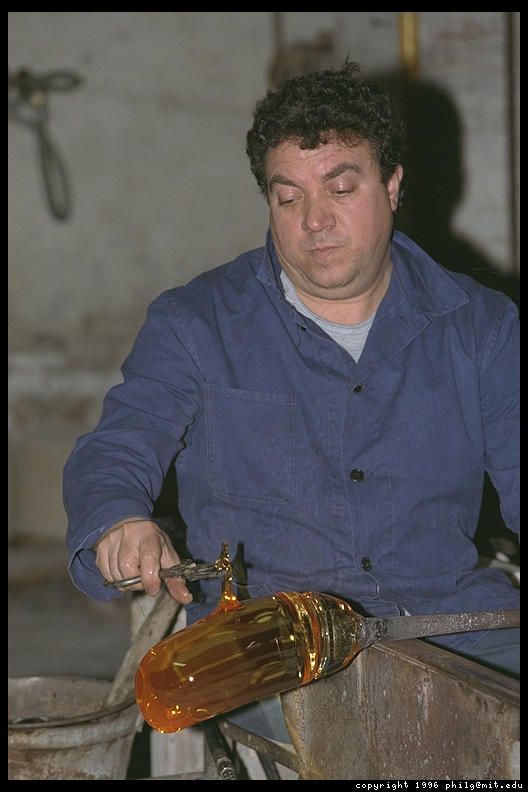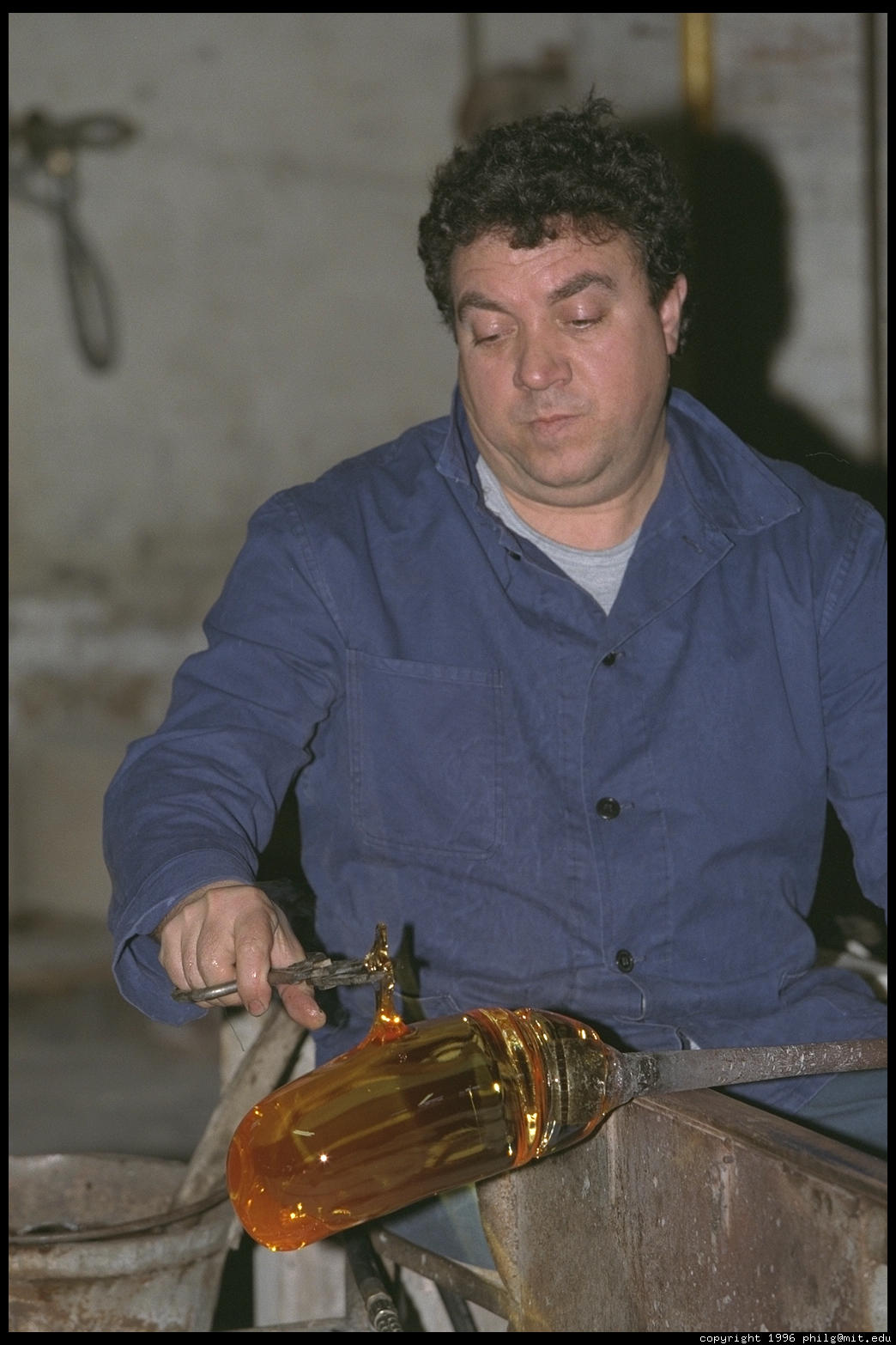 Maestro Barbero starts with a lump of glass that will eventually become a horse, out back behind Seguso, Ponte Vivarini 138, Murano