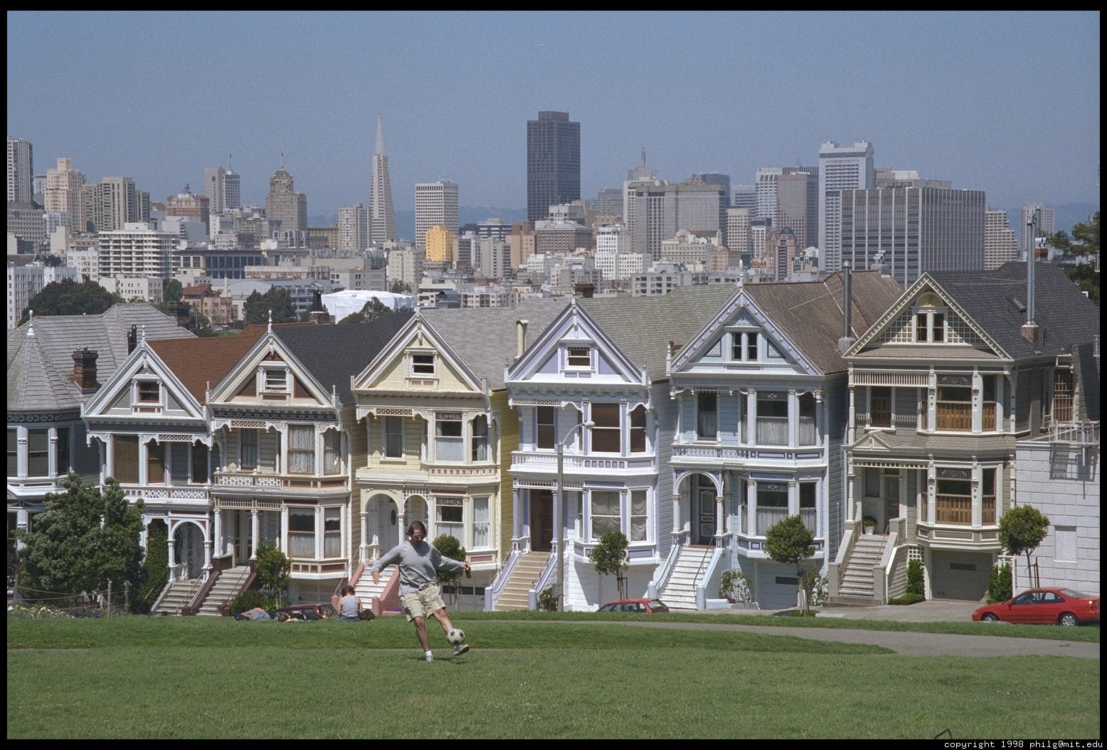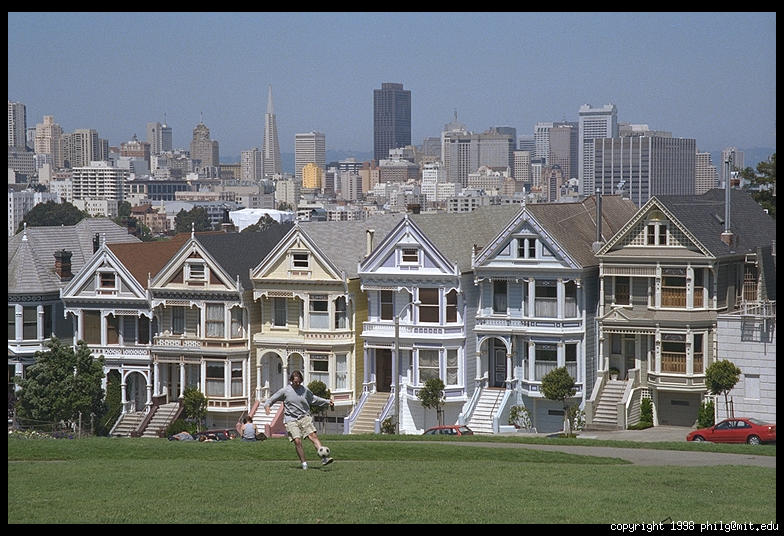 The Painted Ladies Victorian houses of Alamo Square, sometimes referred to as Postcard Row because of the backdrop of downtown skyscrapers.