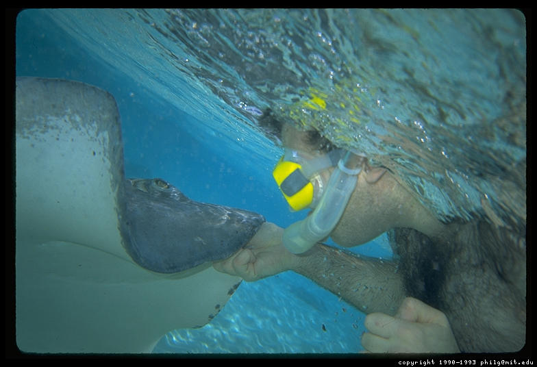 Philip feeding stingray in Stingray City, Grand Cayman, Cayman Islands