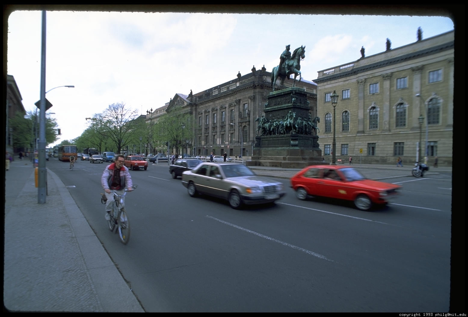 Frederick the Great rides in the middle of Unter den Linden, whose trees were cut down to facilitate Nazi parades