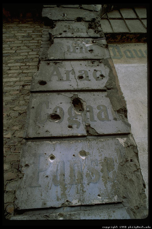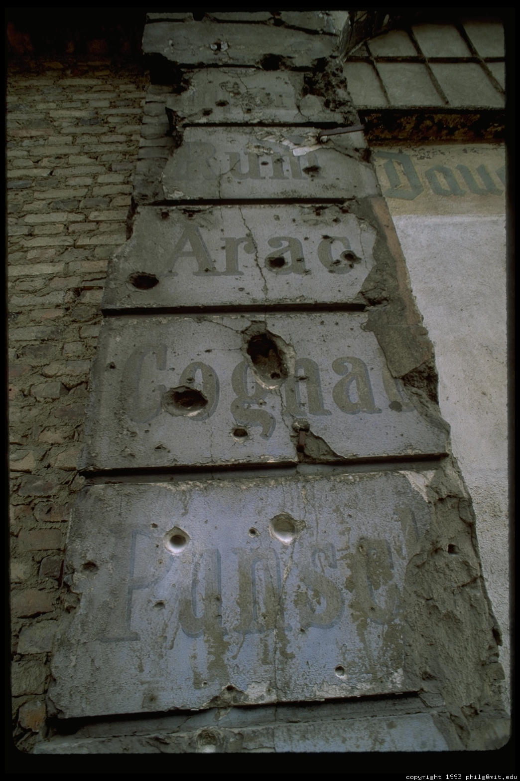 A wall in East Berlin circa 1993 still bears the scars of the Red Army