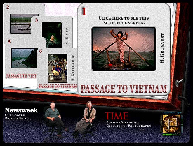 Passage to Vietnam shows you the story behind the pictures. If you are curious about a photo, the photographer will actually walk out onto the photograph and talk about it, pointing at critical elements to illustrate the lecture. This is the first CD-ROM I've seen where there is no stupid little box for video clips. The moving character comes out and interacts with static elements on the screen. It is a brilliant effect. (When what you want to see is a little video of the photographer making the shot, a little inset box appears.)