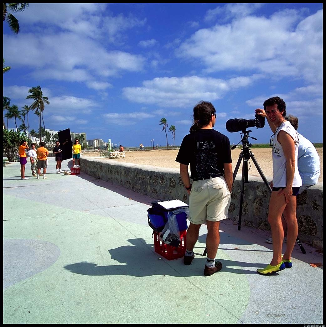 At right: South Beach. Miami. Fashion photography capital of the world. Here a yuppie photographer sneers from the back of his 600/4. He's unhappy at being on the glass end of a Rollei 6008 and 50mm lens. The model is way down the beachfront and he's using a radio to communicate with an assistant holding a reflector by the model (in yellow).