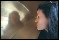 The second element of a portrait studio is controlled lighting. With lights on stands or hanging from the ceiling, you get to pick the angle at which light will strike your subject. With umbrellas and other diffusion equipment, you get to pick the harshness of the shadows on your subject (see out studio photography primer). There are some pretty reasonable portable flash kits consisting of a couple of lights, light stands, and umbrellas. These cost $500-1000 and take 20 minutes or so to set up on location. If you don't have the money, time, or muscles to bring a light package to a project, the standard way to cheat is to park your subject next to a large window and put a white reflecting card on the other side. Don't forget the tripod, because you'll probably be forced to use slow shutter speeds.