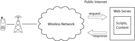 As illustrated above, the cell phone connects to your server through the service provider's wireless network. Depending on the phone and network, the "Wireless Network" cloud may contain standard Internet Protocol (IP) routing, a standard HTTP proxy, or a WAP gateway. In the last case, the gateway and phone communicate using a special set of protocols that, among other things, compresses data before transmission over the wireless network. The net effect is that the phone's browser (sometimes called a microbrowser) looks to a public HTTP server like a standard Web browser issuing HTTP GETs and POSTs.