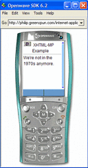 XHTML-MP Example Document % telnet philip.greenspun.com 80 Trying 216.127.244.134... Connected to philip.greenspun.com. Escape character is '^]'. GET /seia/mobile/ex1.html HTTP/1.0 HTTP/1.0 200 OK MIME-Version: 1.0 Content-Type: text/html <?xml version="1.0" encoding="UTF-8"?> <!DOCTYPE html PUBLIC "-//WAPFORUM//DTD XHTML Mobile 1.0//EN" "http://www.wapforum.org/DTD/xhtml-mobile10.dtd"> <html xmlns="http://www.w3.org/1999/xhtml" xml:lang="en"> <head> <title> XHTML-MP Example </title> </head> <body> <p>We're not in the 1970s anymore.</p> </body> </html> Connection closed by foreign host.