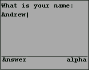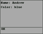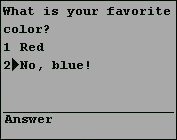 HTTP/1.0 200 OK MIME-Version: 1.0 Content-Type: text/vnd.wap.wml <?xml version="1.0"?> <!DOCTYPE wml PUBLIC "-//WAPFORUM//DTD WML 1.1//EN" "http://www.wapforum.org/DTD/wml_1.1.xml"> <wml> <!-- This is the first card. --> <card> <do type="accept" label="Answer"> <go href="#card2"/> </do> <p>What is your name: <input name="Name"/></p> </card> <!-- This is the second card. --> <card id="card2"> <do type="accept" label="Answer"> <go href="#card3"/> </do> <p>What is your favorite color? <select name="Favorite"> <option value="red">Red</option> <option value="blue">No, blue!</option> </select></p> </card> <!-- This is the third card. --> <card id="card3"> <p>Name: $(Name)<br/> Color: $(Favorite)</p> </card> </wml>What it might look like on your phone: