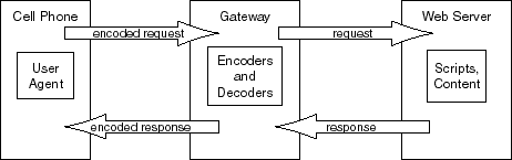 The cell phone connects to your Web server through a service provider's gateway. The gateway translates encoded requests from the phone to standard HTTP GETs and POSTs, fetches the results, encodes the results, and returns the results to the phone. Data are passed between the gateway and cell phone in a compressed binary format, using a WAP-specific set of protocols (i.e., Internet Protocol is not used between the phone and the service provider). The gateway also manages the relatively unreliable network connection to the phone.