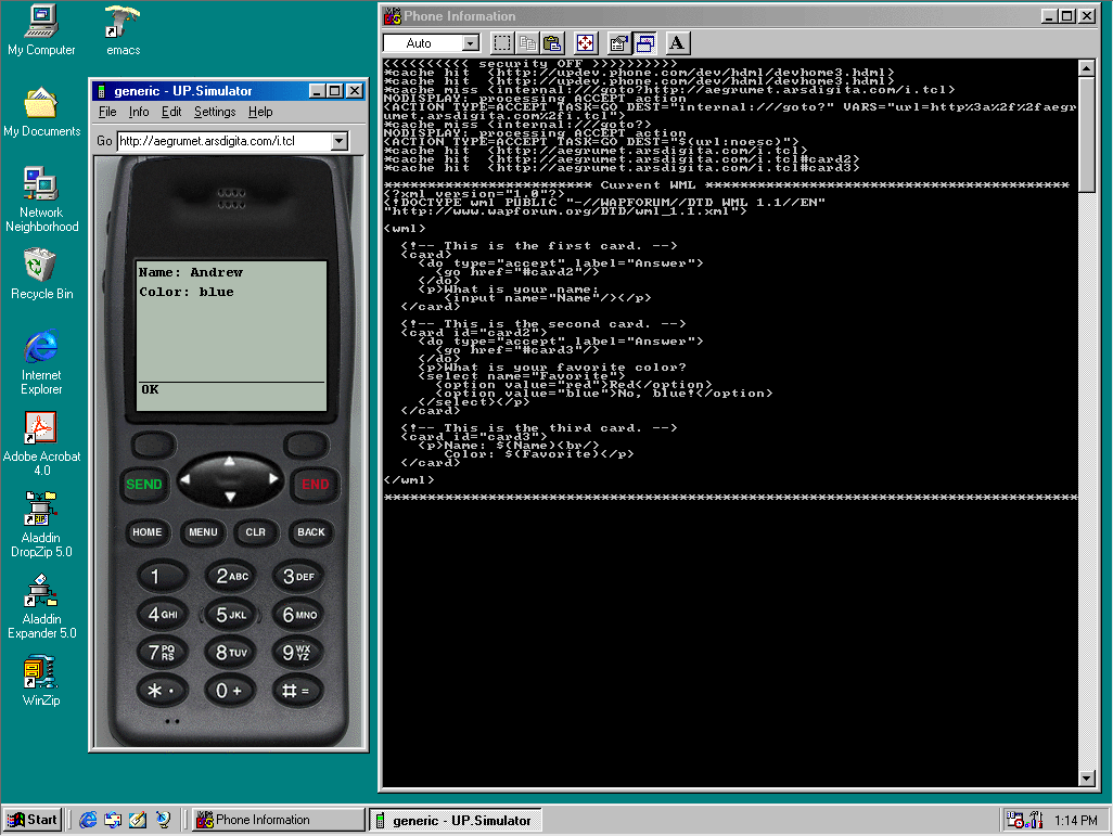 Unwired Planet's UP.Simulator 3.2 running on Windows 98.