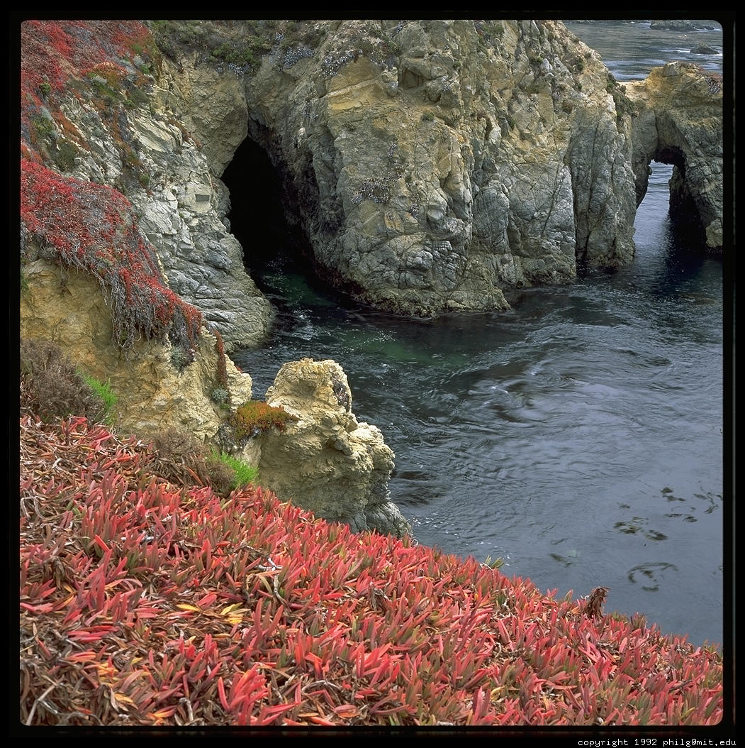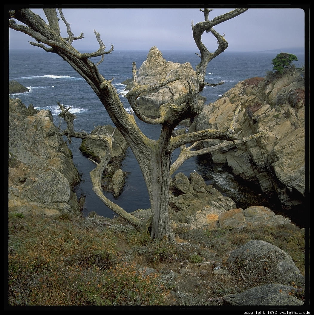 Among all of these horrors, Carmel does have a few treasures. One is the 1790's mission, where Father Junipero Serra is buried. Another is Point Lobos State Reserve, a hard-to-get-into park just south of the town where Ansel Adams, Edward Weston, and a lot of other great photographers roamed with their view cameras (Note: these guys also roamed around the park with naked models, something I wouldn't recommend today because the place is packed with tourists). Finally, there is the Carmel Camera Center, a fantastic photo lab right in downtown. They do C-41 (regular print film) in 1-hour, even with 5x7 proofs. They do E6 (slides) in two hours, though it is roller transport so I don't trust them. They do cheap, fast, and excellent quality reprints here so this is the place to manufacture your own postcards to send to friends.