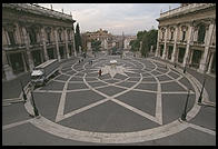 You have to schlep all the way back down the steps and then up a staircase designed by Michelangelo to the Piazza del Capidoglio. Michelangelo was commissioned to redesign the whole piazza in 1536 by Pope Paull III Farnese. He came up with a geometric pavement design, new facades for the Senate (now the mayor's office) and the Palazzo dei Conservatori, and a third building, Palazzo Nuovo, to make the piazza a trapezoid.